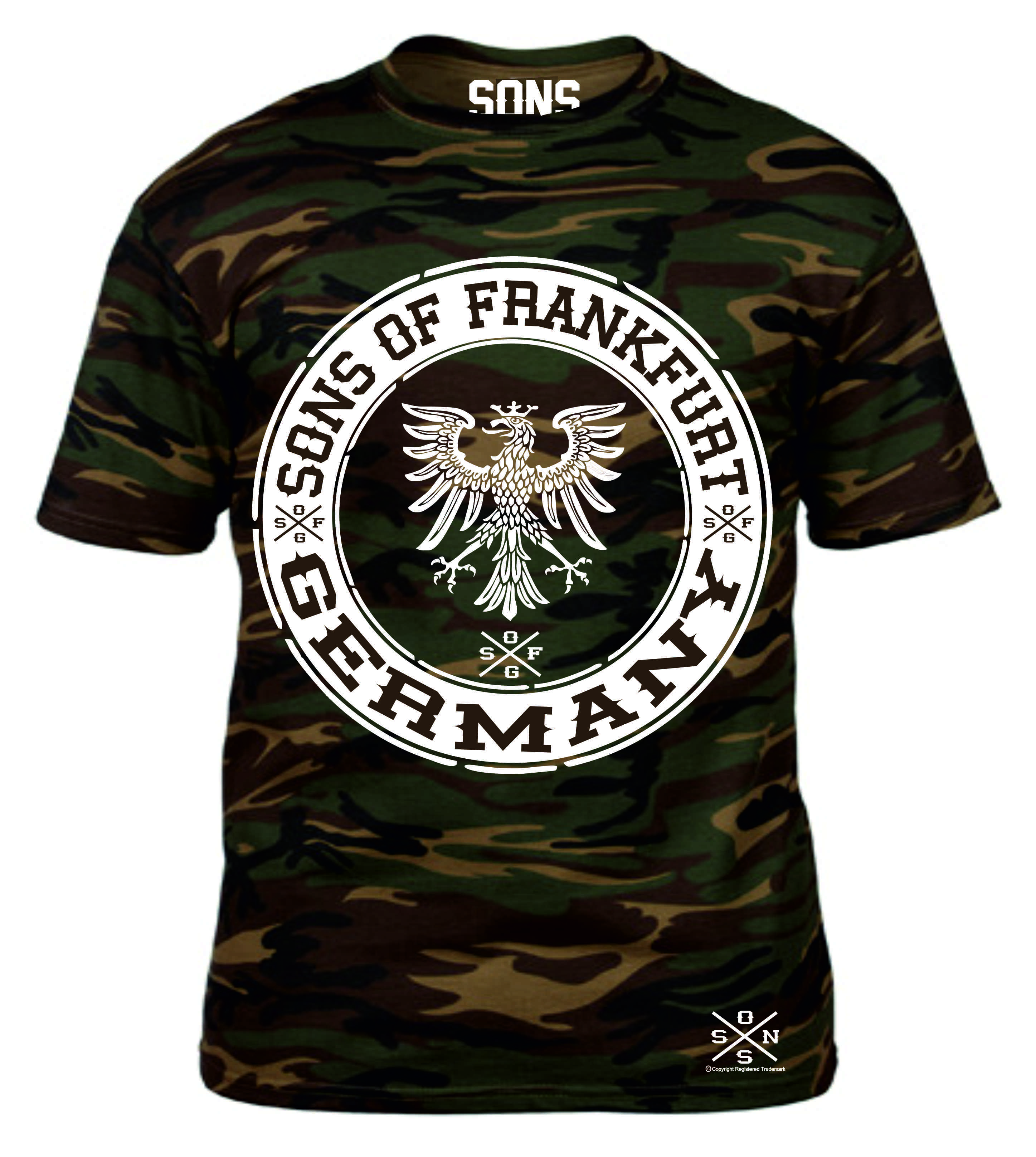 SONS OF FRANKFURT IM ANGESAGTEM CAMOUFLAGE LOOK FRONTPRINT SONS OF FRANKFURT PATCH BACKPRINT SONS OF FRANKFURT LOGO