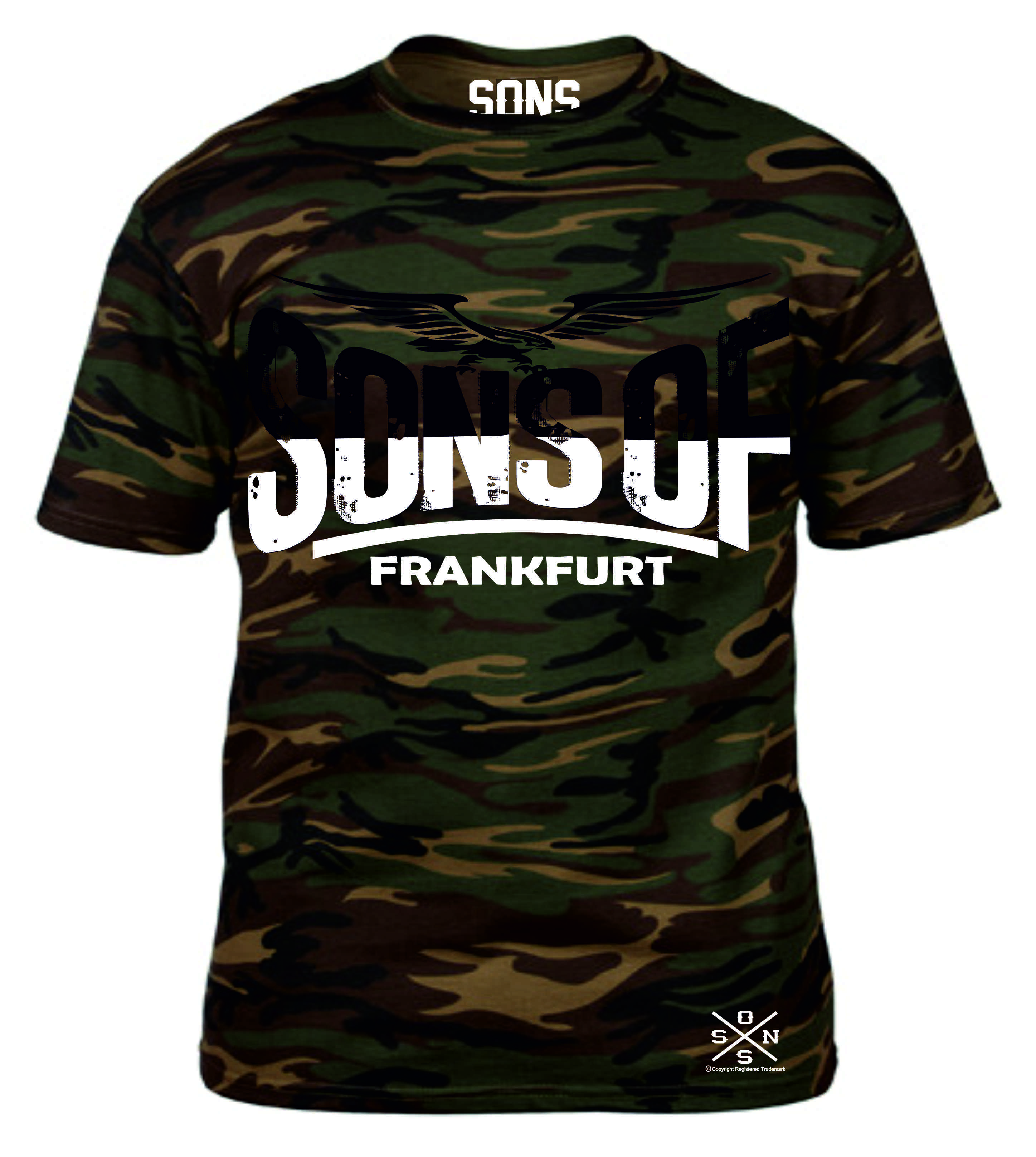 SONS OF FRANKFURT IM ANGESAGTEM CAMOUFLAGE LOOK FRONTPRINT SONS OF FRANKFURT BLACK & WHITE BACKPRINT SONS OF FRANKFURT BLACK & WHITE